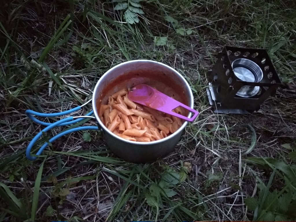 Nachdem ich de Hängematte und das Tarp aufgestellt habe, bade ich mich kurz in der eiskalten Mürz, dann wird gekocht!